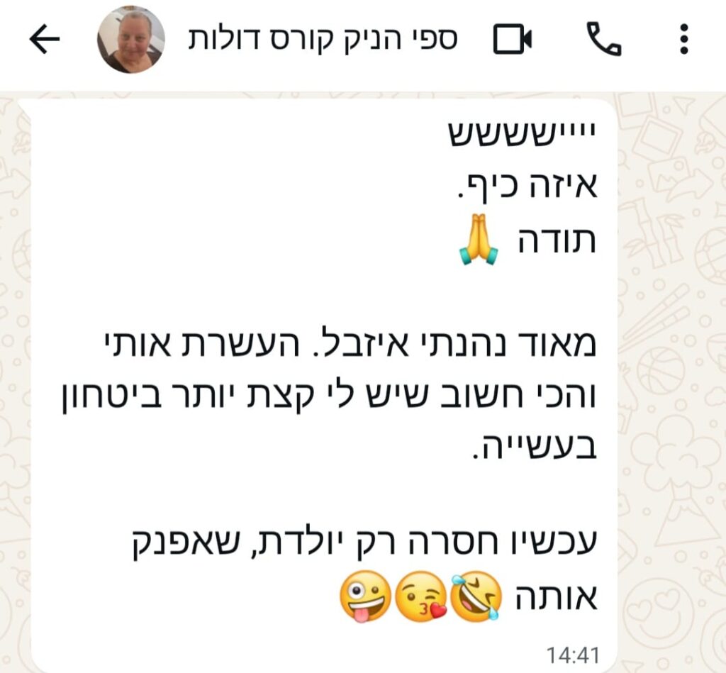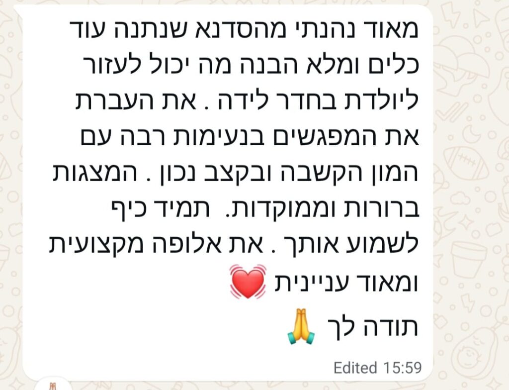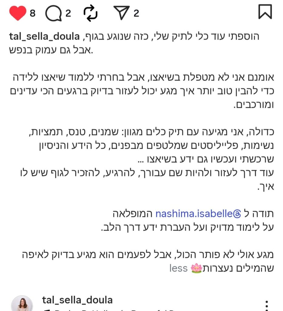 כדולה ותיקה, וגם מעבירה את השיעור שיאצו מעל 8 שנים בכל הקורסים במכללת ללדת וגם זו שמכשירה דולות.